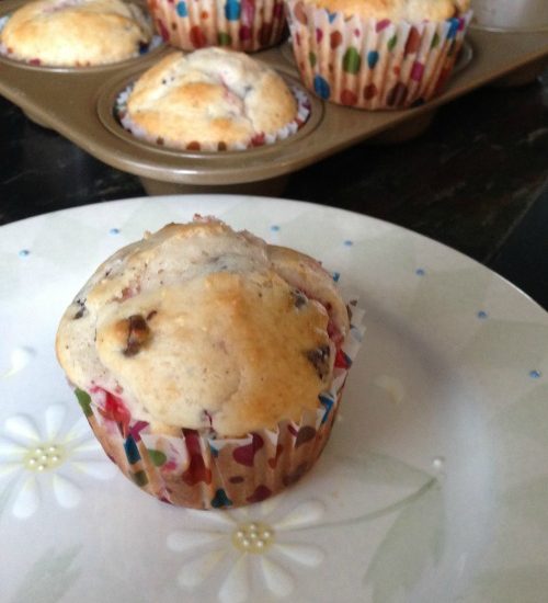 My kids love muffins. They could eat their weight in muffins. Their favorite are my banana muffins, until they tried today’s yummy creation! Strawberries were super cheap at the grocery store so I bought a lot…too much, actually. So I started thinking of different things I could use the strawberries for. I had a package of chocolate chip muffins in…